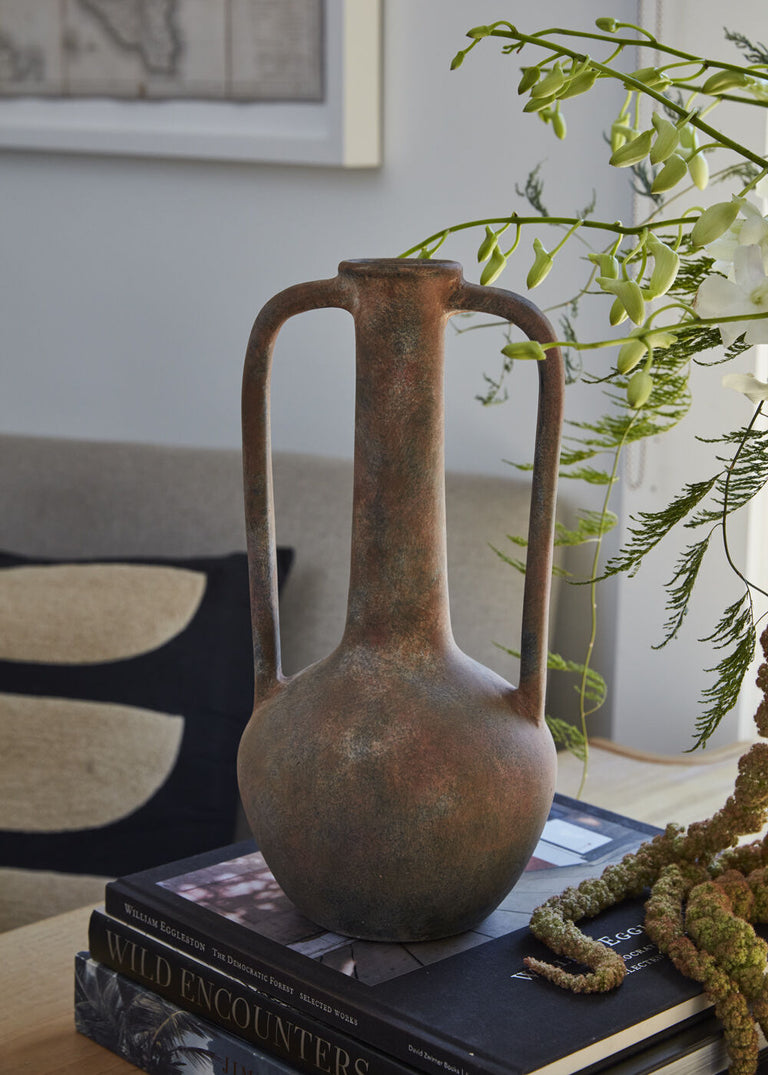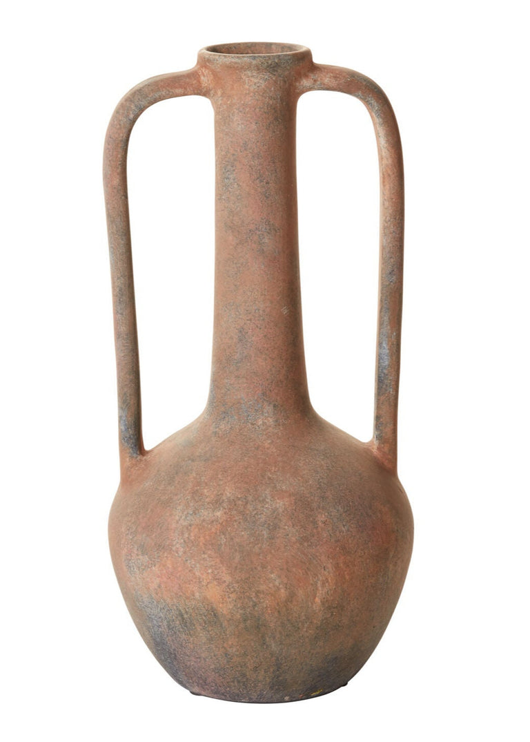The Tupiza Vase is as old-world as it is fresh & funky. Made from terracotta with an aged painted, slightly textured finish, this unique oversized sculptural vessel makes a beautiful artisanal display on its own or grouped with the other Tupiza styles to resemble collectible heirlooms. Fill this watertight vase with dried or fresh florals.