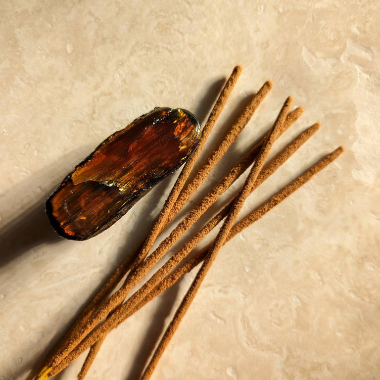 Amber has an alluring, musky aroma that is softened by the powdery scent of our incense, reminiscent of fragrant nag champa, a ritual favorite, that opens up the amber with floral hints of rose and lily.