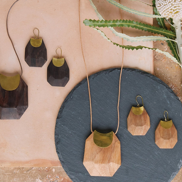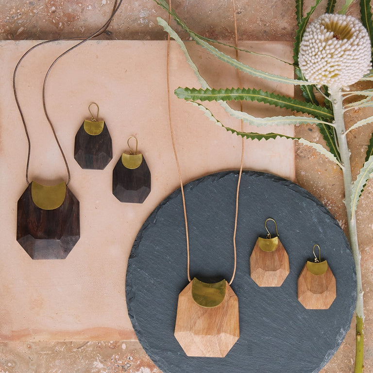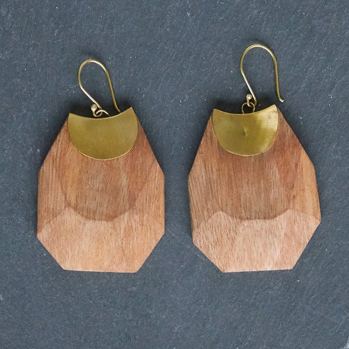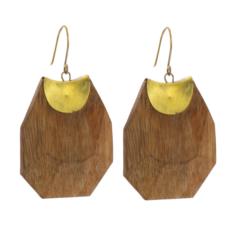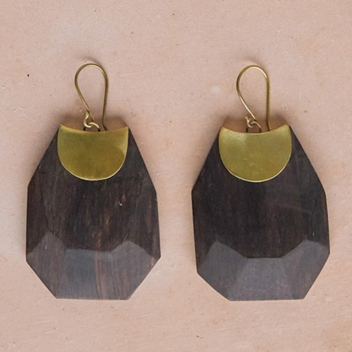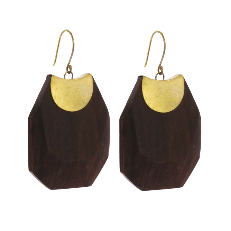 Dark:  Faceted wood forms made of Javanese Teak are clasped in brass for a chic pairing of materials. 1.5"x2.75"