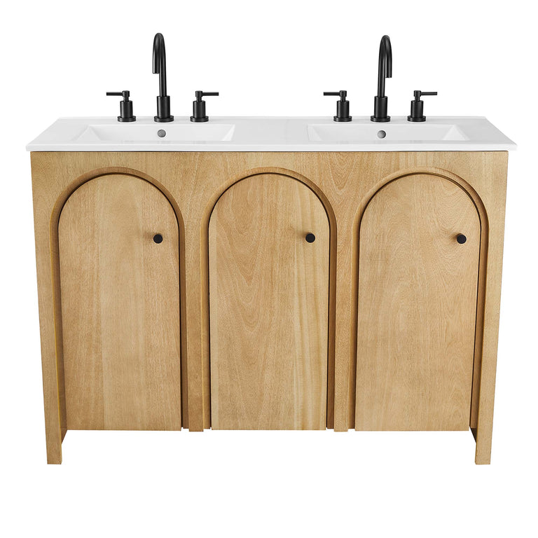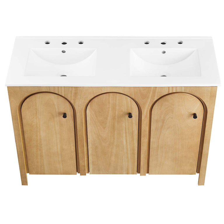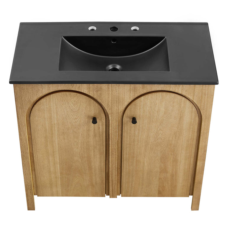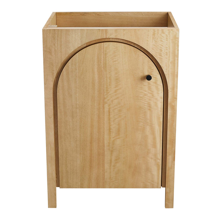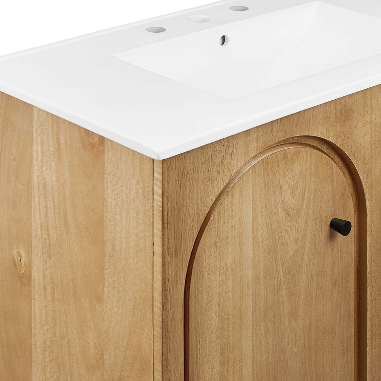 Elevate your bathroom's style with the Appia 24" Single Bathroom Vanity, where retro elegance meets functionality. Expertly crafted from high-quality MDF and adorned with a mango wood veneer, this vanity cabinet brings stunning organic aesthetics to your bathroom. Its unique arched door adds beautiful dimension to any primary or guest bathroom. Featuring soft-close hinges, the Appia compact vanity offers a smooth, quiet experience and includes an adjustable shelf with a convenient plumbing cut-out, providing ample storage for all your small space vanity bathroom essentials. With its white ceramic sink basin with 8" centerset holes and integrated countertop, this sink cabinet easily becomes a functional centerpiece in any bathroom. Assembly is straightforward, ensuring you can enjoy this stylish and modern vanity effortlessly. Includes adjustable non-marking foot pads to protect flooring. Fixtures not included.