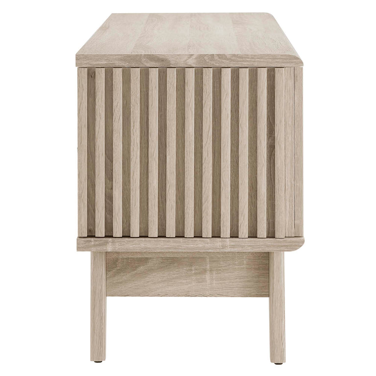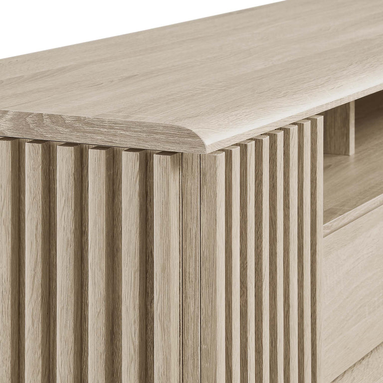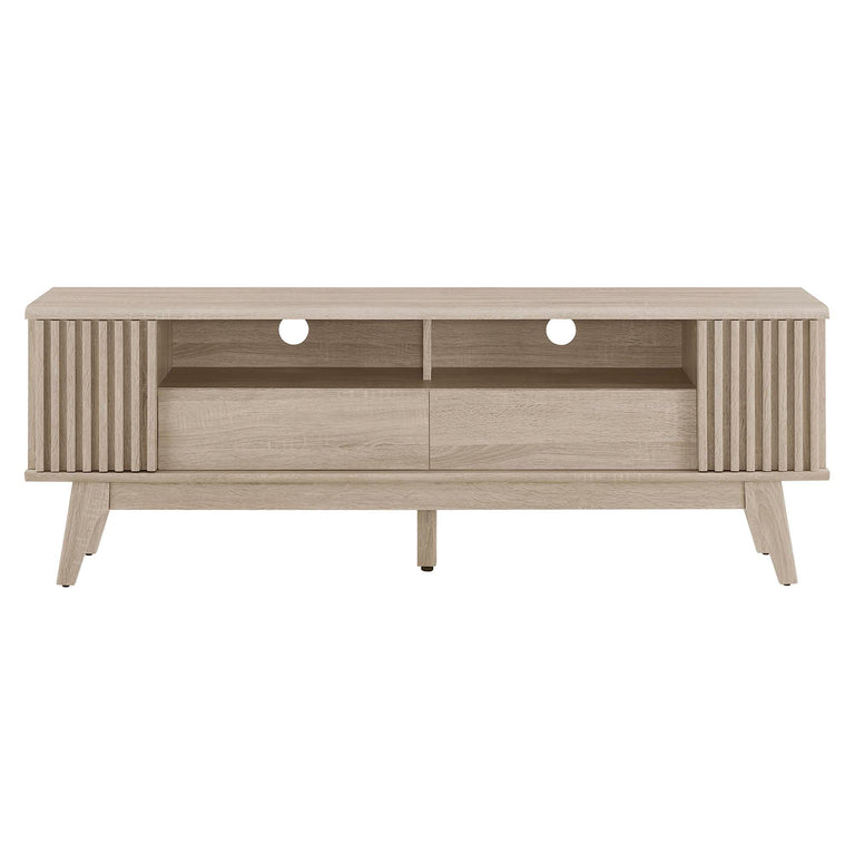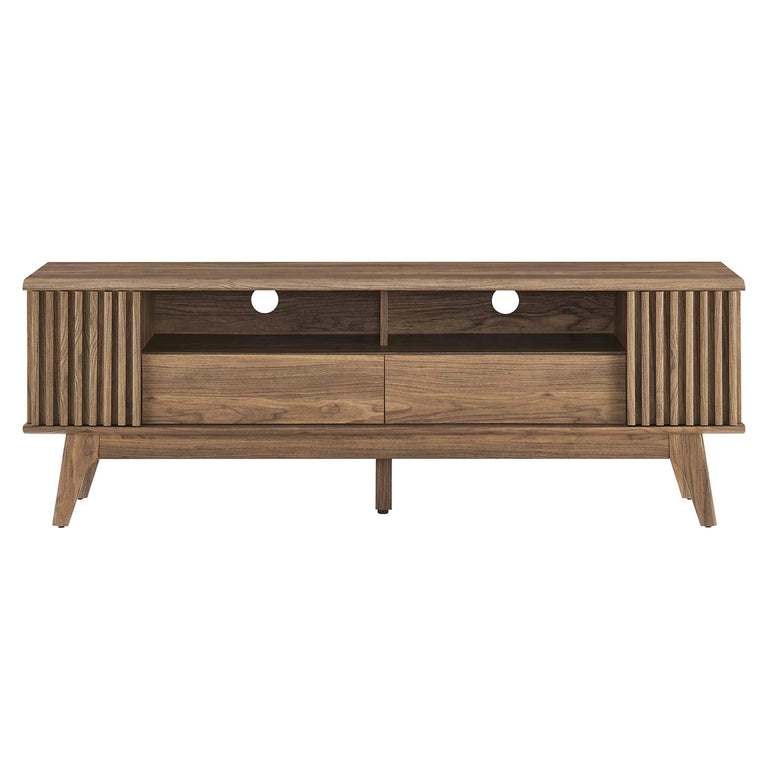 Transform your living space with the Eudora TV Stand. Constructed with MDF and particleboard with a beautiful wood grain design, this entertainment console is both stylish and durable. The perfect addition to a living room, family room, or lounge area, this versatile piece serves its purpose as a modern TV stand with ample storage for media essentials and cable management holes. Vertical slatting on the hinged doors grants elegant definition to its overall look. With open and concealed shelving areas and full-glide drawers, this media center is designed for both storage and display. Bringing mid-century inspiration to the home, its splayed base and non-marking foot pads ensure stability and protect your floors from scratches. Assembly is required, but our easy-to-follow instructions make it a breeze. Weight Capacity: 200 lbs.