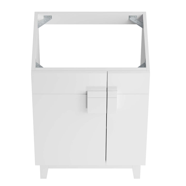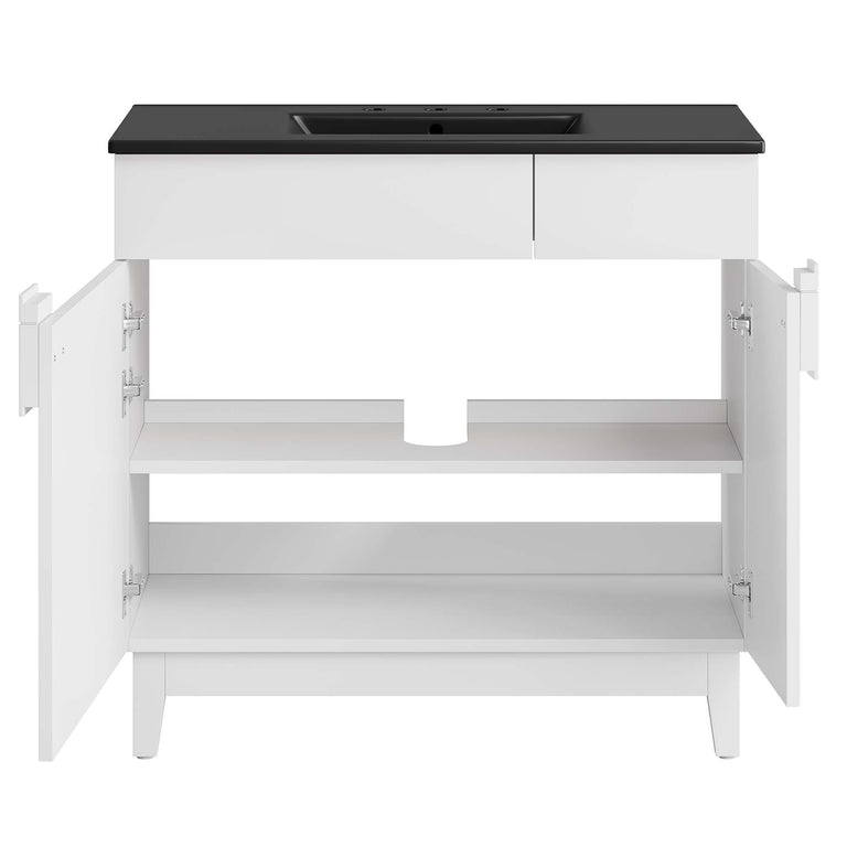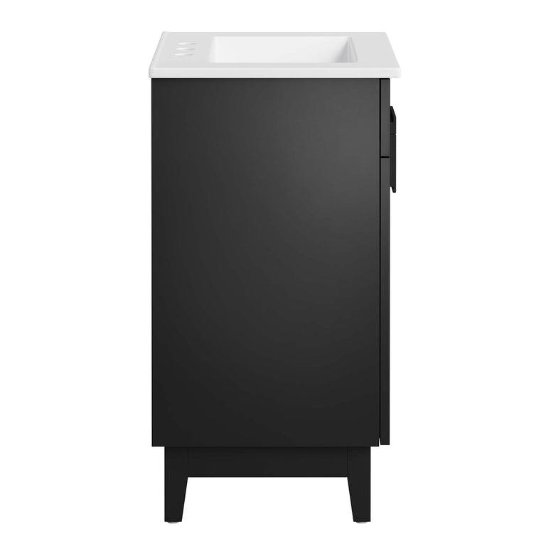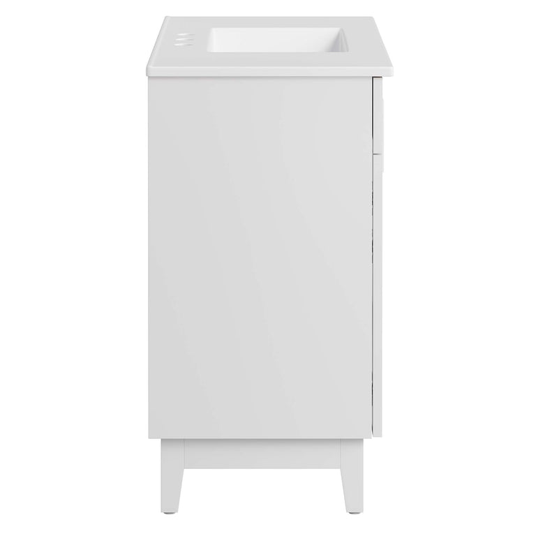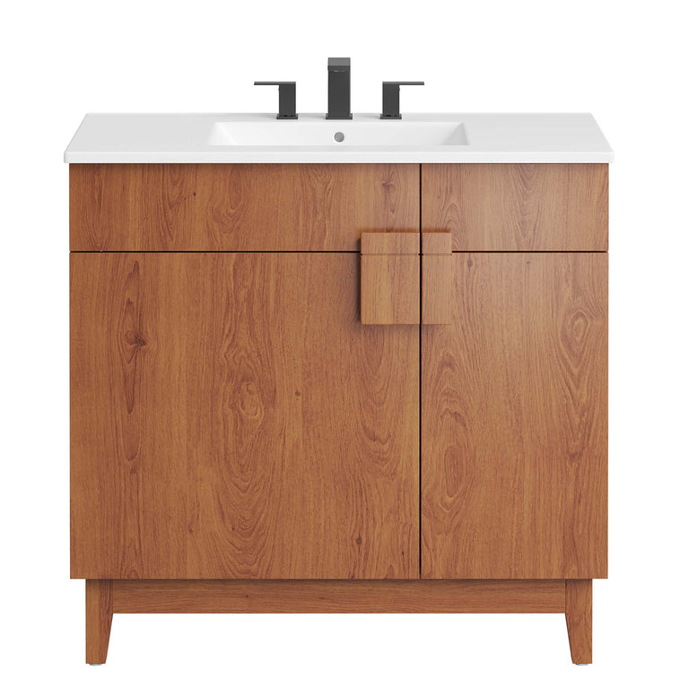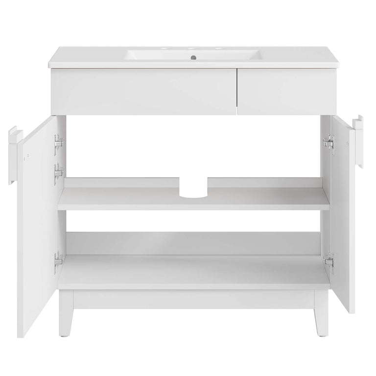 Update your bathroom decor with the modern allure of the Miles 24" Bathroom Vanity. Made from particleboard adorned with a sleek melamine laminate, this vanity stands on four tapered rubberwood legs, equipped with non-marking tack glides to protect flooring. Featuring a curved ceramic basin sink with an integrated countertop and 8-inch centerset faucet holes, this vanity is a complete bathroom upgrade. The unique design showcases two metal hinged doors, featuring an intriguing asymmetrical layout, and accentuated by a split square handle for a modern touch. Inside, you'll find ample storage on two spacious shelves, perfect for organizing bathroom essentials. Miles features a cut-out design to accommodate plumbing. Fixtures not included. Assembly required. Weight Capacity: 200 lbs.