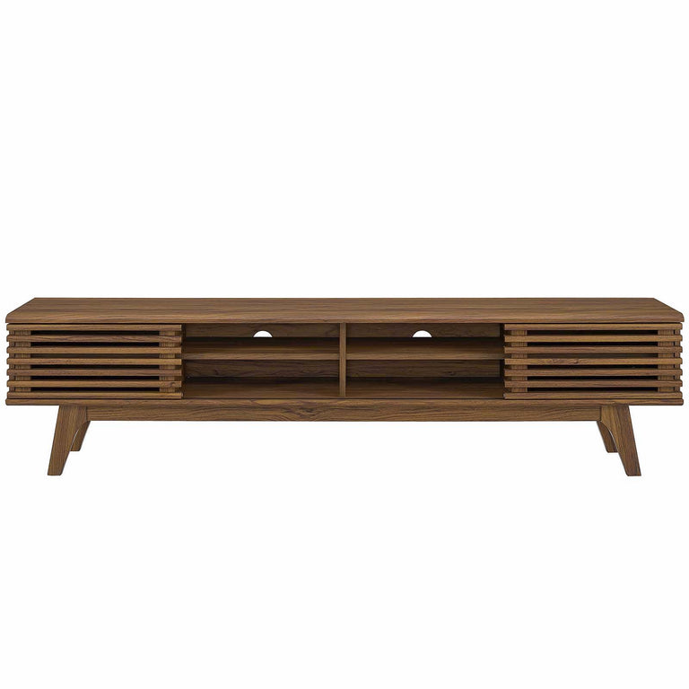 Mid-Century Style 70” TV Stand Dual Slatted Sliding Doors Four Media Storage Cubbies Smooth Wood Grain laminate Two Cable Management Holes Two Adjustable Storage Shelves Durable Particleboard Construction