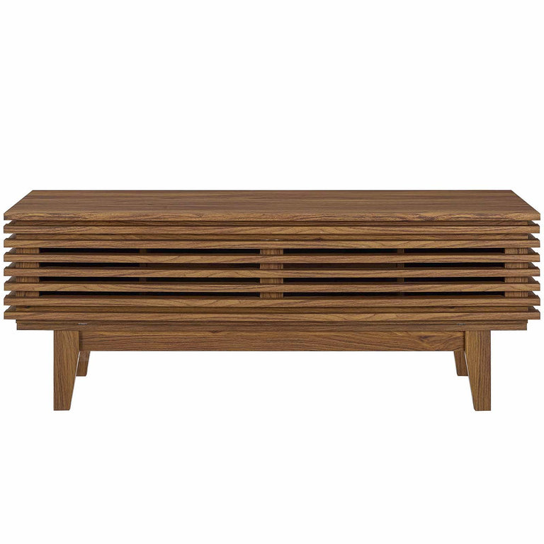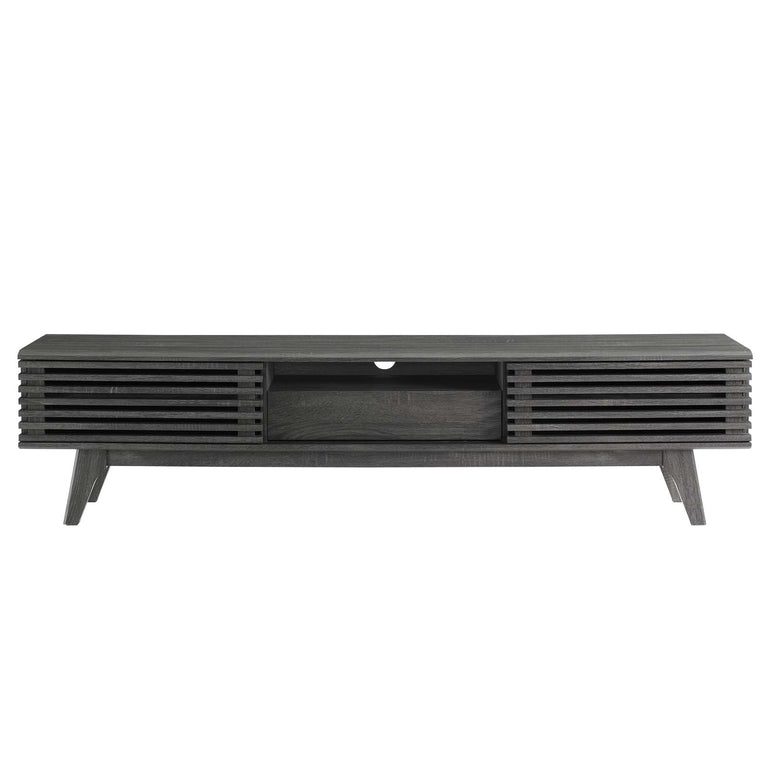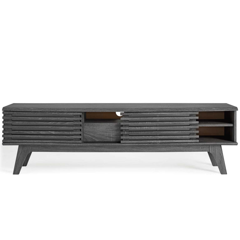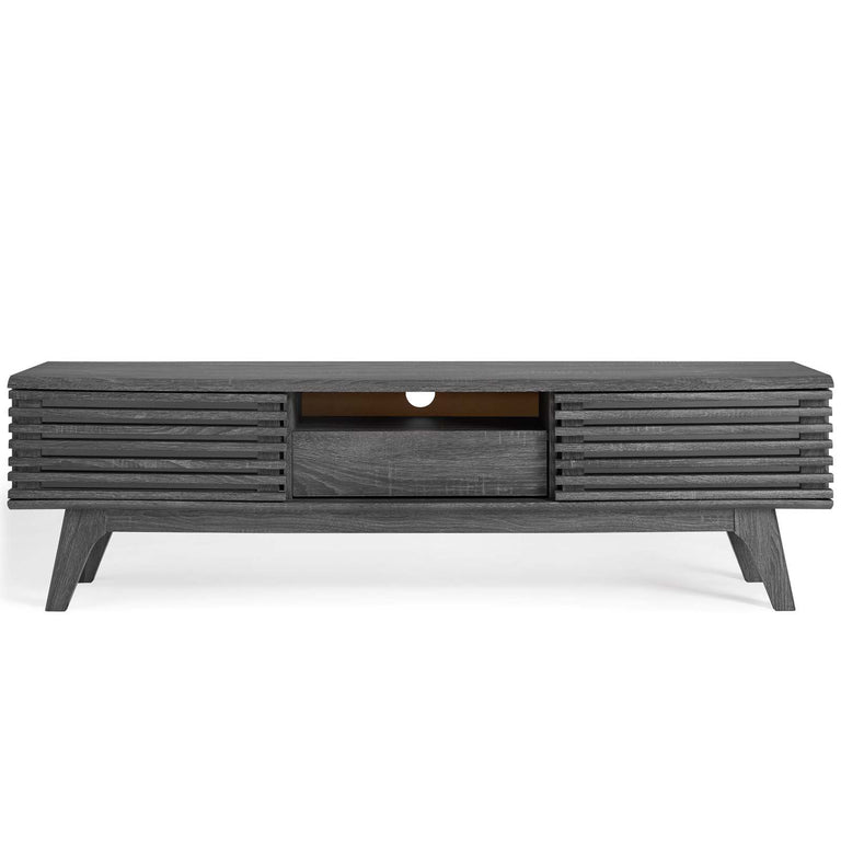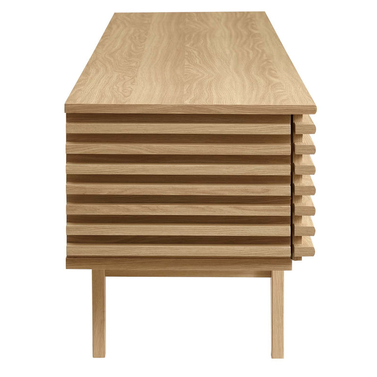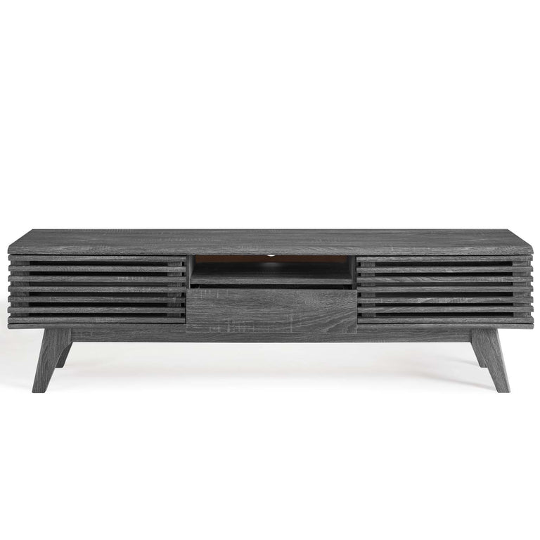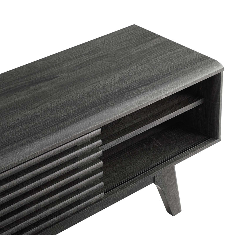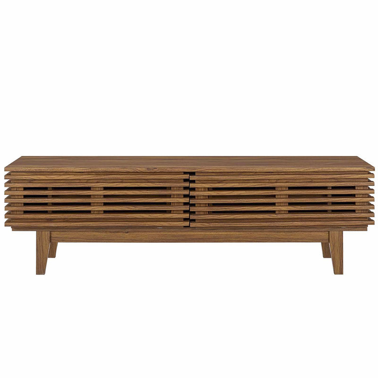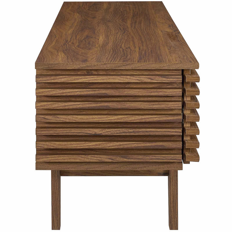 Tap into mid-century aesthetics with the Render 50" TV Stand. This installment of the Render collection features a durable particleboard frame with a smooth walnut grain laminate, four tapered wood legs, an adjustable shelf, a center cable management hole, side storage areas, and a bottom-hinged door for easy access to shelf storage. This versatile mid-century modern living room table features a solid construction with a pleasing look and practical functionality. Perfect for media storage, Render accommodates flat-screen TVs up to 50” wide. Set Includes: One - Render 46" TV Stand
