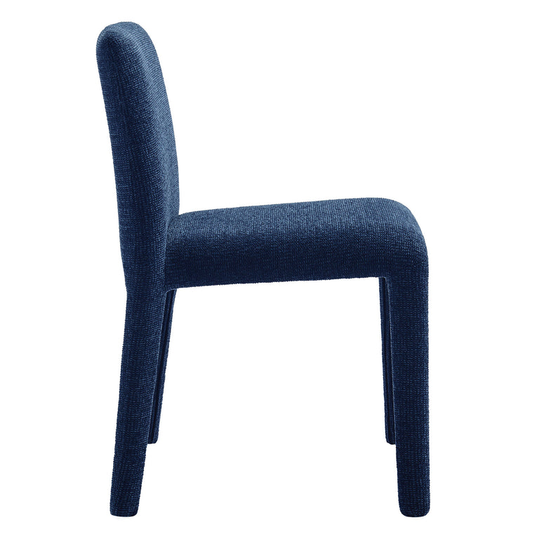 Bring an understated sophistication to your dining or living space with the Rhodes Dining Chair. Fully wrapped in soft, textured chenille fabric—including the legs—this modern accent chair exudes sleek elegance. The dining side chair's fully upholstered minimalist design features a high square backrest with subtly rounded edges and a padded seat for exceptional comfort. Made from recycled plastic bottles, the upholstery fabric is also OEKO-TEX® STANDARD 100 Certified. Perfectly suited as a side chair, desk chair, or as a living room accent chair, Rhodes complements a variety of interiors, from contemporary to mid-century modern. Non-marking floor glides protect your floors, and this upholstered dining chair arrives fully assembled for effortless setup. Weight Capacity: 300 lbs.