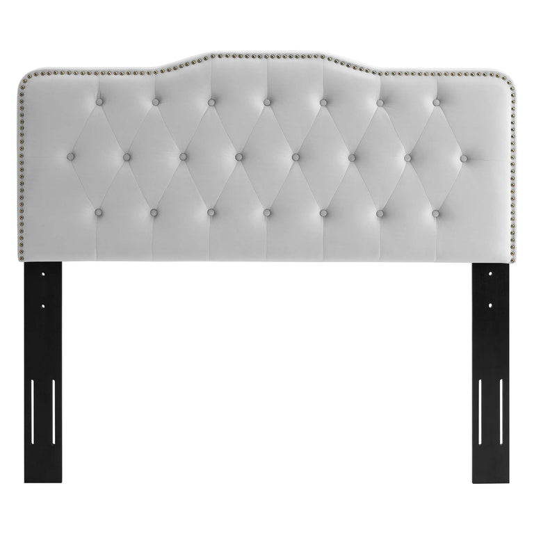 Refresh your master bedroom or guest bedroom with the glam deco style and vintage modernity of the Sophia Tufted Performance Velvet Full/Queen Headboard. Adorned with classic button tufting and framed with nailhead trim, this full/queen size headboard features a charming silhouette. Upholstered in stain-resistant performance velvet, this padded headboard offers supportive comfort while sitting up in bed resting and relaxing. An elegant addition to the bedroom, this height-adjustable headboard for full or queen bed frames is complete with five mounting positions. Assembly required.