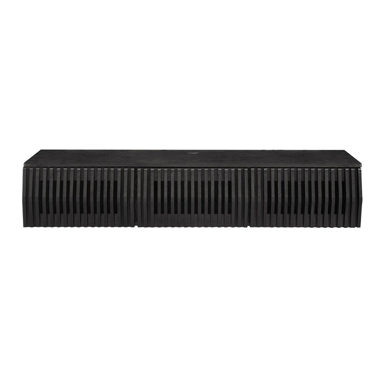 Immerse yourself in the minimalist and functional elegance of the Vaughn Wall Mounted TV Stand. Covered in a smooth laminate finish, this wall mounted TV cabinet provides a sophisticated and contemporary touch to any living space. Its vertical slatted design masterfully conceals three drop-down doors, offering ample concealed storage for media essentials and more. Perfect for the modern living room or lounge, this floating TV stand also features a discrete opening in the back and a cleverly integrated grommet on top for efficient cable management. Whether you're furnishing a chic entertainment center or a cozy recreation area, the Vaughn under TV console is designed to impress, ensuring your media setup is both stylish and organized. Assembly required. Weight Capacity: 192 lbs.