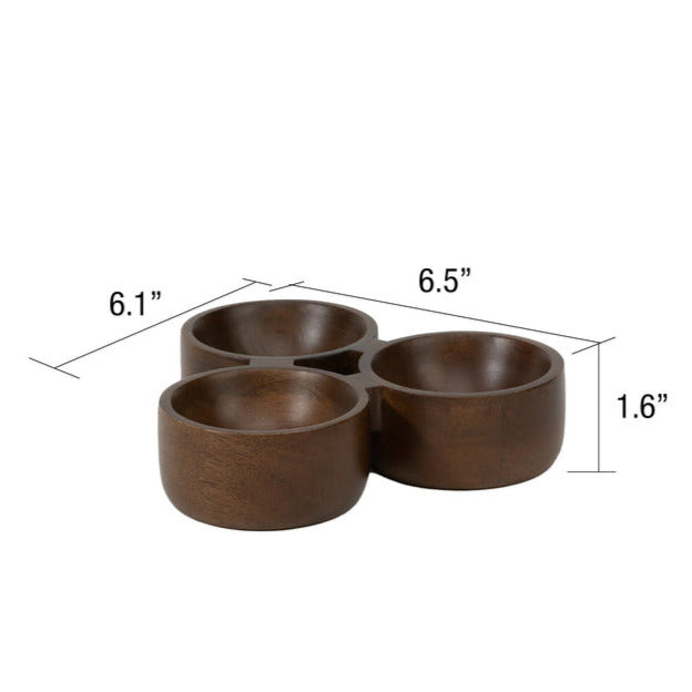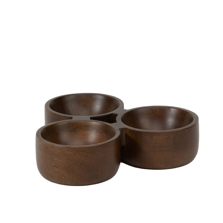 The Serra™ trio bowl is meticulously crafted by hand from natural mango wood and adorned with a rich walnut finish. This multi-purpose trio bowl can serve food offerings such as nuts, sauces, dips, or salsas but can also be used as a candle holder for tealights or votives. No matter the use, this bowl will tackle the challenge in a subtle yet sophisticated manner.