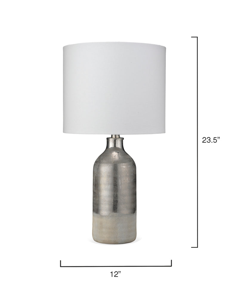 With an air of casual glamour, this ceramic table lamp features an off-white and contrasting pewter glaze. The iridescent sheen meets the off-white glaze to create an imperfect, polished-yet-rustic aesthetic. Lamp is topped with a linen shade that helps emit a calming glow in any room.