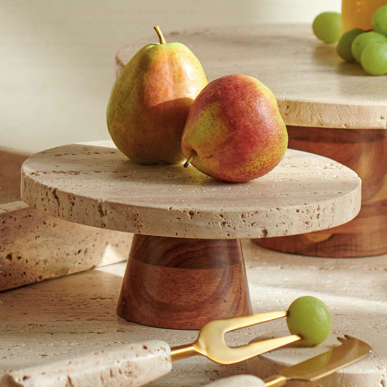 We mount creamy travertine on a golden toned acacia base to create a pedestal worthy of a roman banquet or tea with royalty. Stack our smaller presentation piece on top of our larger one for a tiered food presentation worthy of an old world palatzo. Sized for condiments, candies, or small cakes.