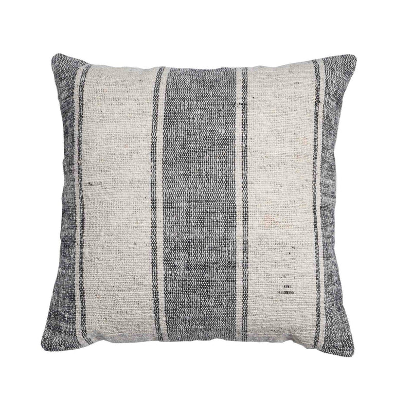 We prefer our cushions comfortable. Let the family and the guests command attention not the pillow covers. We like subtle shades and soft cottons. The more subtle, the more we feel at ease and we hope you do too. The secret to the muffled shade of blue in these broad stripes is not the dye color we chose but the clever intermixing of the creamy colored yarn from the warp. The result is bold but not loud. Strong but not overpowering.