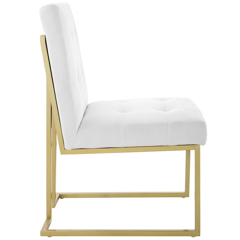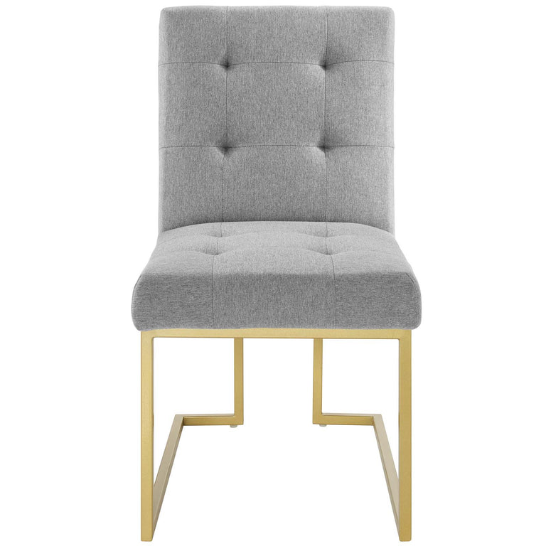 Gold Finish Glam Deco Dining Chair Biscuit-Tufted Details Soft Polyester Fabric Upholstery Gold Stainless Steel Base Dense Foam Padding Comes Fully Assembled Chair Weight Capacity: 331 lbs.